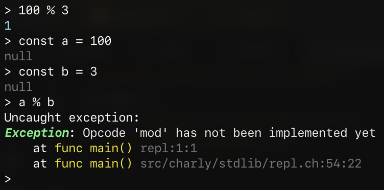 It turned out that my AST optimizing pass understands how to constant-fold remainder-operations, but the actual VM didn’t. I quickly added the missing opcode and the error went away.